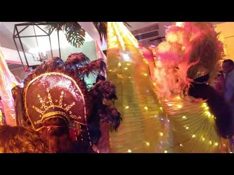 At this moment, dancers in dazzling costumes burst onto the scene, drummers pound out contagious beats, and entertainers in extravagant outfits weave through the crowd, pulling guests onto the dance floor. The atmosphere erupts into a whirlwind of movement, with feathered headdresses, LED props, and even stilt walkers adding to the spectacle.